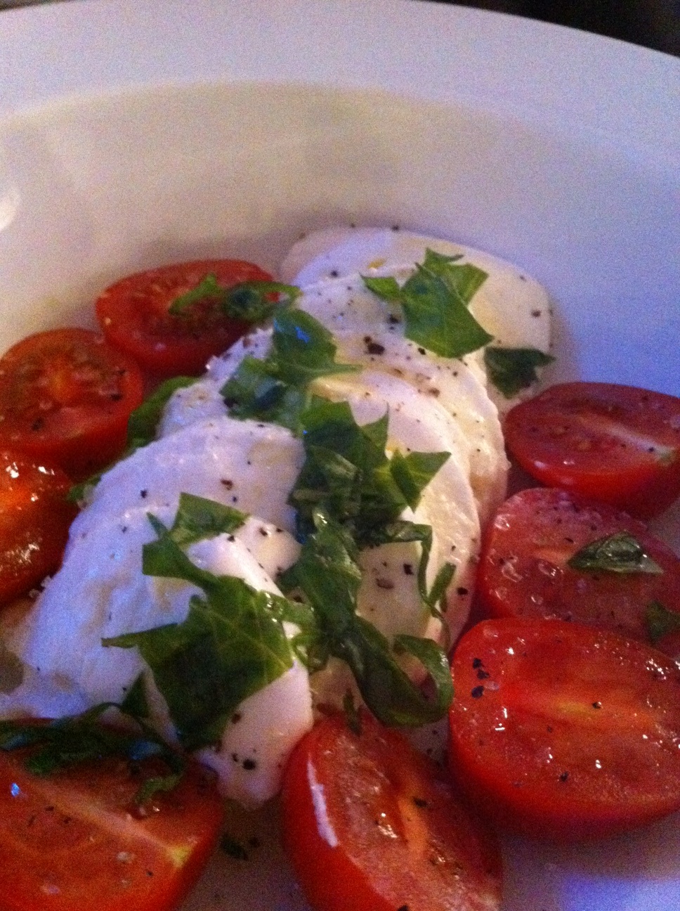 Simply slice the mozzarella with a very sharp knife into 1/4 inch pieces. Chop about 6 leaves of basil. Half 4 vine tomatoes. Layout accordingly onto plate, a light drizzle of EVOO a heavy pinch of sea salt. Sprinkle the chopped basil. Finally fresh cracked pepper.