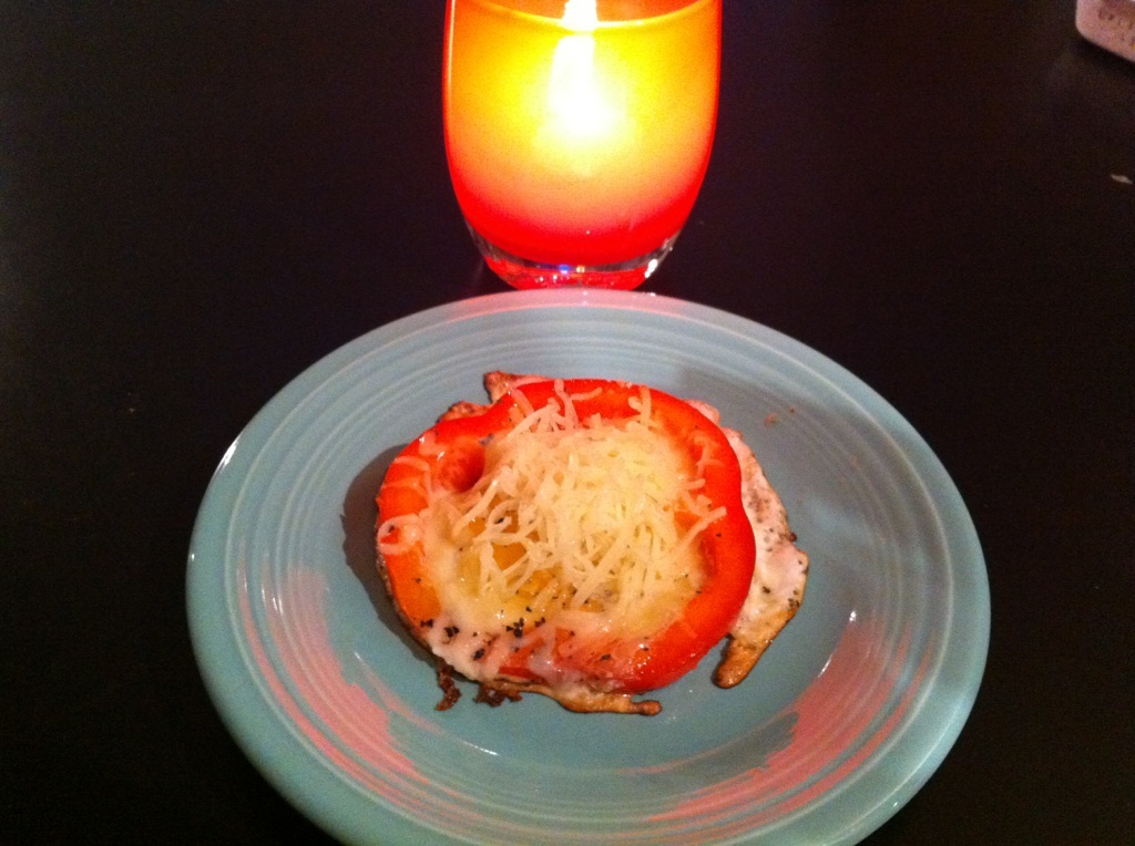 Melt a little butter in a pan (medium/high heat). When completely melted and bubbling, add one bell pepper ring and let is sit for about a minute. Crack an egg in the middle of the bell pepper ring and add a bit of salt and pepper. When the egg has turned white, then add shredded cheese (any cheese works- I used Monterey Jack and I imagine that Pepper Jack would be great). Reduce the heat to medium and cover the pan with lid. Cook until the cheese has almost melted completely and remove from heat…keeping the lid on. Give it about a minute (cheese should be melted) and plate it! I gave mine a little kick with Frank’s Red Hot Sauce (from Red Apple on 23rd & Jackson no relation to Frank’s Produce :0) but you can use any hot sauce you see fit.