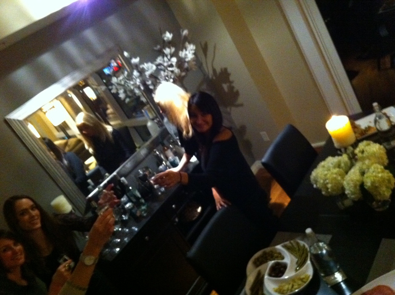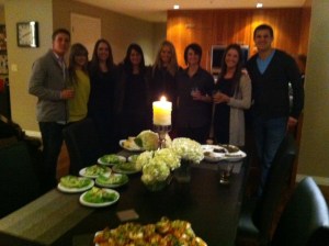 We started the party with shots and wine. Then the first dishes were the appetizers…ours and another couple(Justine and Ryan)…of which they prepared a awesome brucshetta (will try and get recipe and post later). From there we moved on to salad which a friend (Daniella) prepared (shrimp, arugula, truffle dressing salad also great). The hosts (Jake and Brie) prepared a veal dish with broccoli rabe again also bomb. Finally we got to desserts both great.