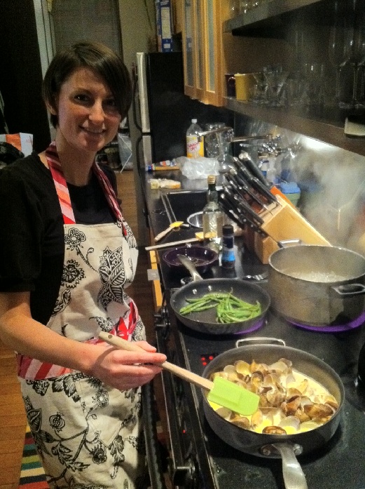 We get home and head straight for the pots and pans and began by boiling lightly salted water for the linguini. Rule #1 when I cook with Ashley…pour her a glass of wine…it just eases the tension when there are two cooks in the kitchen 😎 We heated a saute pan with extra virgin olive oil, two cloves of garlic through the garlic press, two twigs of thyme, 4 leafs of sage (my confidence with the saute pan has grown since Sunday). When the pan got ever so slightly hot we put the clams in and covered with a lid…as the clams opened up I gave the pan a couple splashes of white wine vinegar and a pat of butter. I hit the clams and sauce with a little truffle salt and fresh ground pepper and let the sauce reduce. After about 1 min I poured in a little heavy cream to thicken up the sauce….waited 2 more min on a medium heat…clams with white sauce…done!