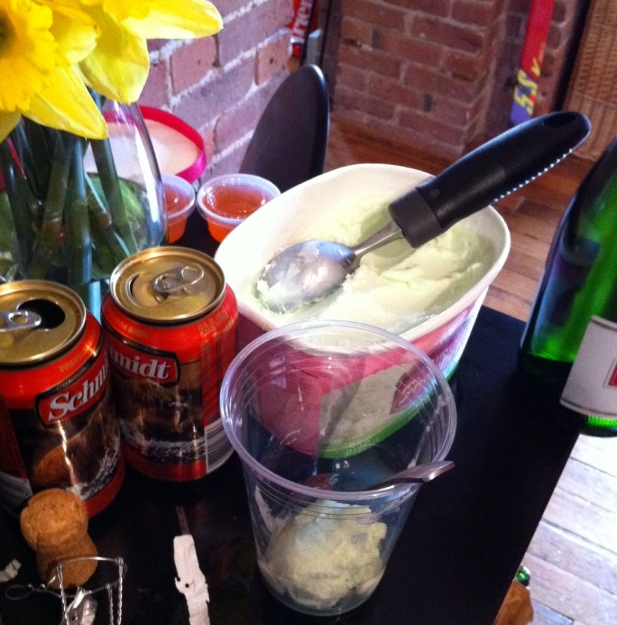 When guests started to arrive, we served a new concoction- a Sparkling Shamrock- made of lime sherbet (one ice-cream scoop), champagne and one drop of green food coloring. Was an awesome mimosa alternative and will probably do this for the 4th of July (raspberry sherbet with blueberry garnish)! We of course had green beer but that was more popular after all the champagne and jello shots were gone ;0)