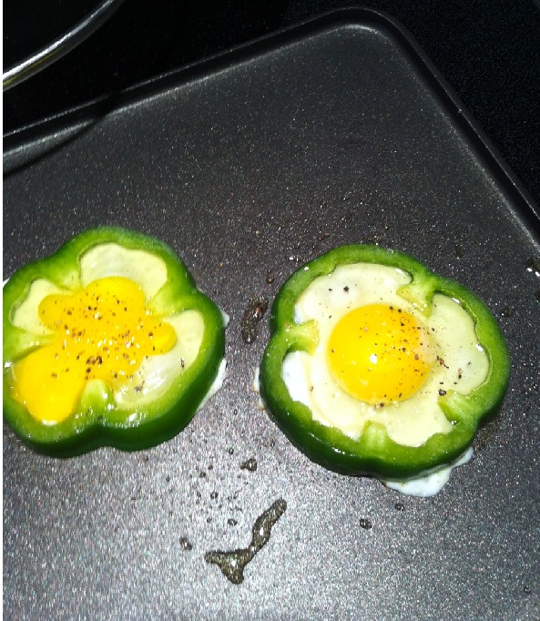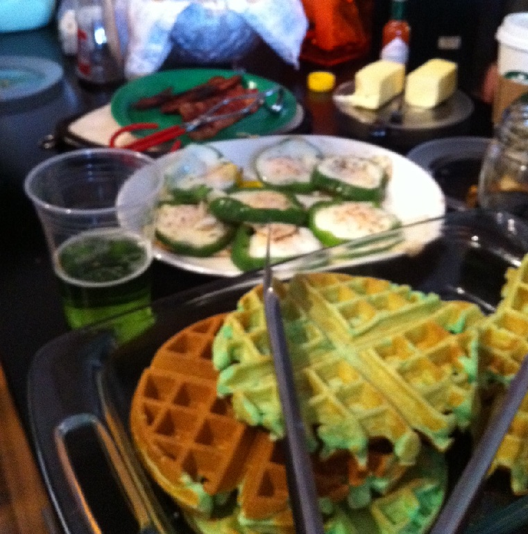 We had a pretty hungry group so we immediately started serving green waffles (belgian waffle mix with food coloring), eggs in a green pepper frame, bacon and a corn-beef potato hash my dad made (also had green & yellow bell peppers) – YUM!