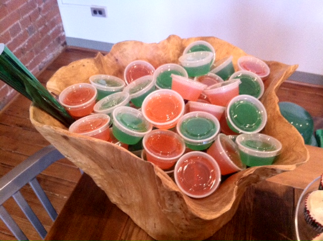 Maggie and I started Friday night making just over 100 Green (lime) and Orange (peach) Jello Shots. Jello Shots are always a fun time…and I mean always :0) There are a bunch of ways to make them but I stick to the simple – 2 cups boiling water, 1 large Jello flavor of choice (my favs are the berry & melon fusions), 2 cups vodka (I prefer Stoli- not top shelf but definitely not the worst) and 2 oz cups with lids (I get them at Cash & Carry in Ballard).