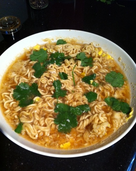 Put the noodles in a bowl and empty about 1/2 to 3/4 of the flavoring on the noodles. Then fill the bowl up with 1-2 cups hot water (really depends on your preference). Crack the egg on top and then put it in the microwave for about a minute…stir…pop it back in for another minute…stir…30 seconds and then remove the Ramen from the microwave. Top with the cilantro and sprinkle red pepper flakes on top. Enjoy!