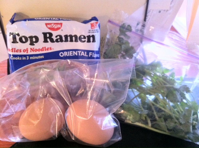 I eat Top Ramen. There, I said it…I eat Top Ramen…and I have to say that I actually enjoy it. I know it is high in sodium and Mark constantly reminds me of a stat he found somewhere…”Top Ramen noodles stay in your body for up to 7 hours, regular noodles stay in your body for 2-3 hours” BUT when I add veggies, eggs, etc, I feel like I am transforming the Ramen into a healthy lunch, right? Right. Anyway, this morning on the way out the door I grabbed an egg (from Ms. Chicken’s Eggs, Vashon Island) and some cilantro to go in my Ramen.
