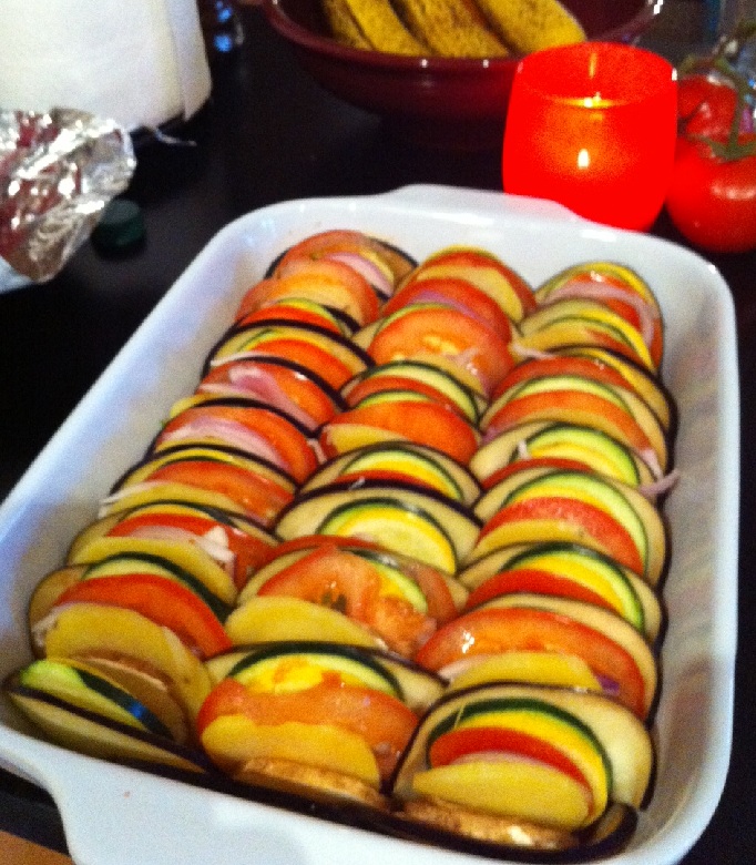 Prepare your baking dish…drop about 1-2 teaspoons of olive oil in the dish and coat the sides. Empty the tomato base in the dish and coat the bottom evenly….then start arranging the prepared vegetables in rows on top of the base. We arranged- eggplant, zucchini, squash, shallot, tomato, sweet potato and mushroom…continuously…over and over.