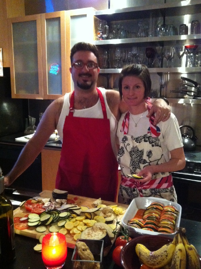 I LOVE Ratatouille (the movie)…and have been wanting to make the dish for sometime now. Mark failed to mention that we also had our first French lesson last yesterday so we were especially in the mood for a traditional French dish. I did a little research on different recipes and honestly they were all across the board, which was a bit surprising to me. Mark, seeing the window of improvisation, decided to capitalize on the opportunity :0) so we totally made our own recipe going on what is depicted in the movie….a little scary but it turned out amazing!
