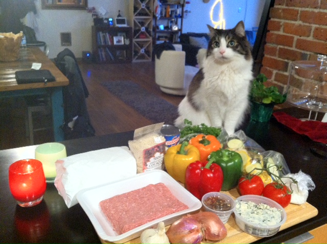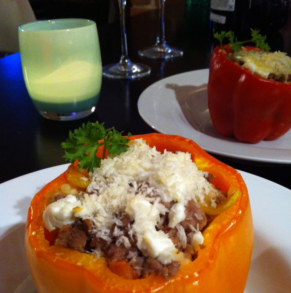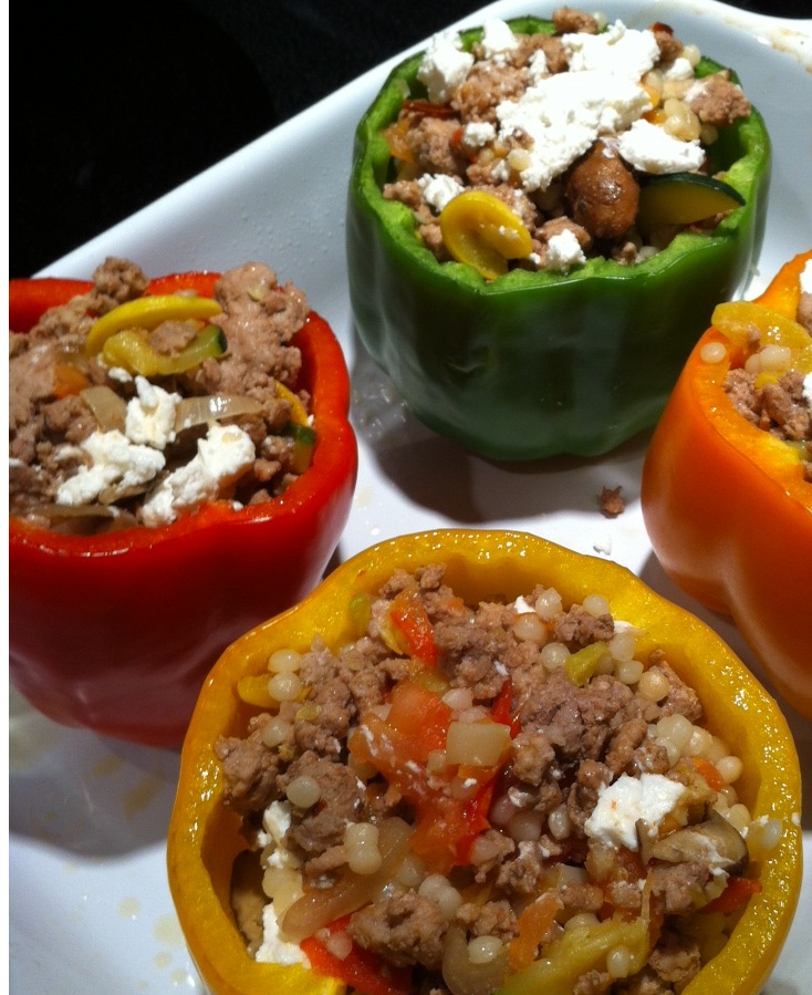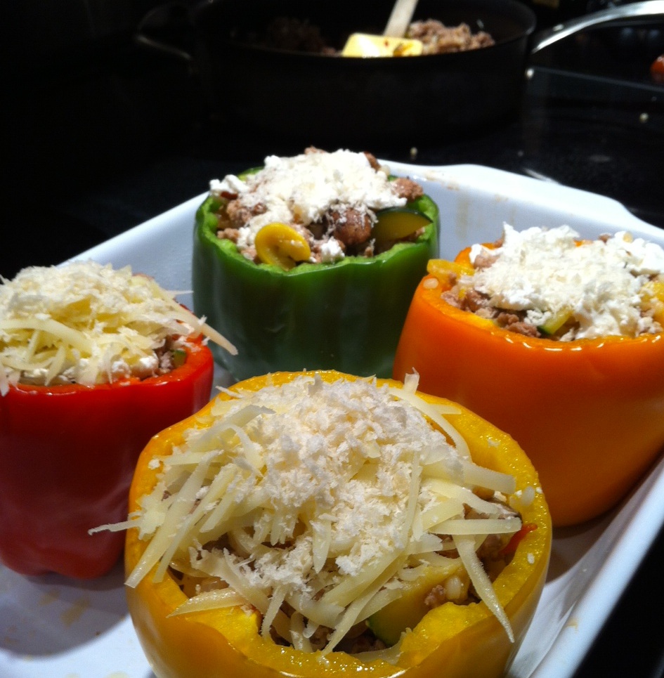 Ratatouille…the gift that keeps on giving! We still had a ton of veggies leftover from Sunday’s feast…mushrooms, zucchini, squash, shallots, etc…and a bit of ground beef and goat cheese from Mark’s filet mignon, SO when I was at the lower Queen Anne Safeway this evening, I was really trying to come up with a meal that could incorporate what I had at home. We both agreed that we wanted something on the lighter side (which instantly ruled out our “go to”… pasta) so as I walked produce land, I ran right into 10 for $10 Assorted Bell Peppers. BINGO- Stuffed Bell Peppers!