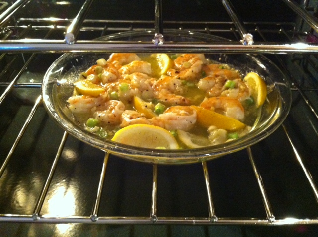 Remove the pan from the oven and add the butter, moving it around in the pan until it is melted completely. Then add the shrimp, garlic, green onions and lemon evenly coating with the oil mixture…no need to squeeze the lemons!