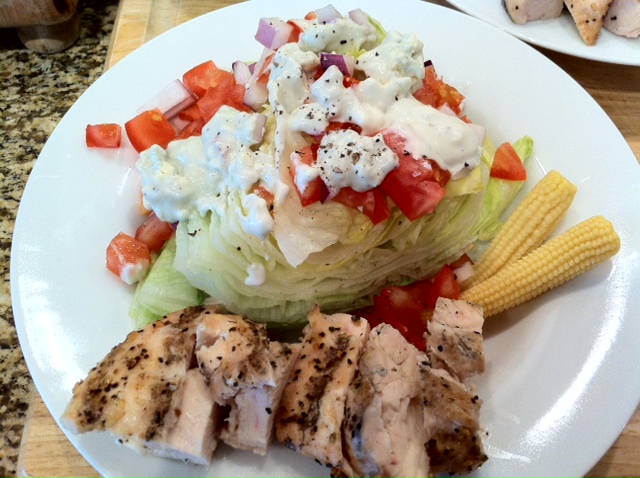 In celebration of the wonderful weather we are having, Maggie and I thought we would try our luck at the grill tonight. We wanted to keep it light so we made iceberg wedge salads with grilled chicken and shrimp.