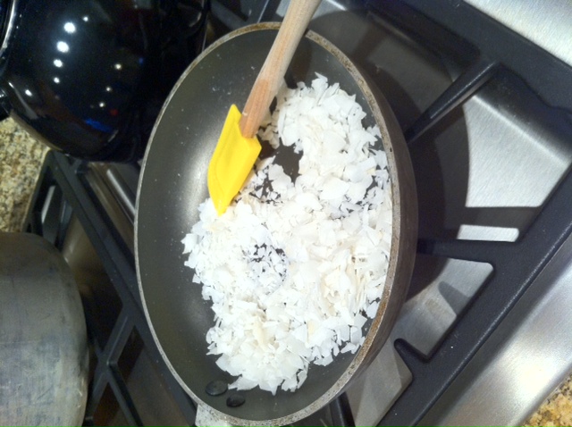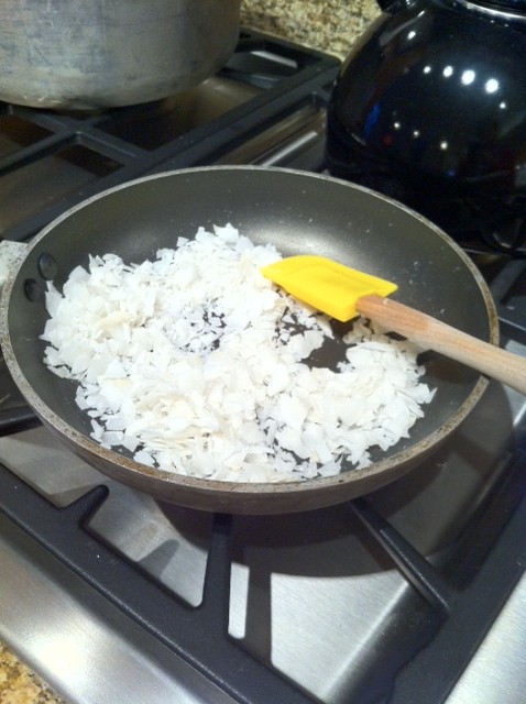 OPTIONAL* Because I added the coconut flavoring, I also decided to toast coconut flakes and add to the cream. In a small saucepan on medium heat, add about 3/4 cup coconut flakes. It is important to carefully watch the coconut flakes because they can burn quickly! When they start to brown, remove them from the heat and let them cool before adding to the cream mixture.