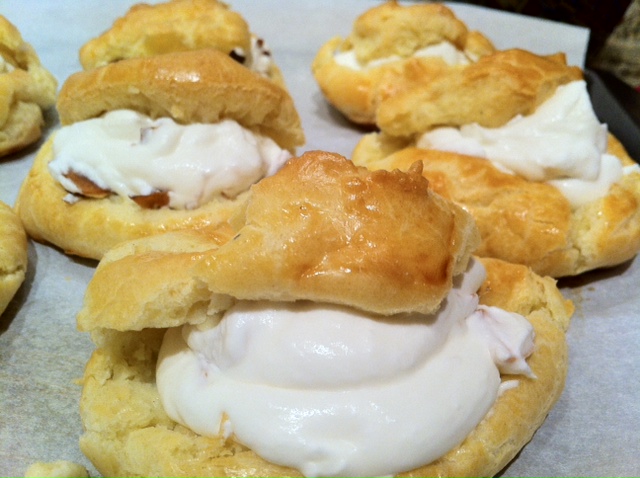 I first tried the cream puffs last year and I was amazed at how easy and fool proof the recipe really was! I started craving them last week so last night I decided to make a batch while Mark’s crab cakes were chilling…2 cooks + 1 kitchen + 1 cat = Seattle Cook Nightmare…so to keep my sanity, I offered to clean up his mess if he would evacuate the premises :0)