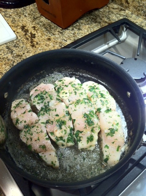 This is probably the most important part…heat the pan on the stove up pretty damn high. Then firmly/quickly press the four cuts of halibut skin side down onto the pan. This ensures a very good sear/ cripst skin and no sticking to the bottom of the pan. Let the halibut cook for about 1 – 2 minutes on that high heat. After the good initial skin side down sear, turn the stove to med-low heat and throw in a couple pats of butter, parsley and thinly sliced garlic. With a decent sized spoon as the butter melts, scoop into the melted butter and pour the hot butter over the halibut do this every 15 to 30 seconds for 3 – 4 minutes (depending on your cut of halibut)…as your hand gets tired flip the haibut over and cook for about 1 more minute.
