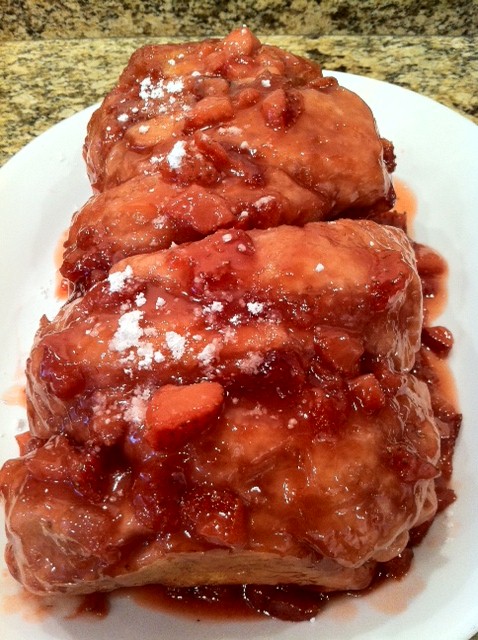 The title rhymes! :0) I made Sticky Buns a while back and wanted to try something a bit different. Strawberries are on sale right now at Whole Foods so I picked some up and thought I would try making my own fresh strawberry preserves/sauce with a twist.