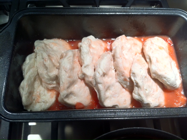 Pour about half of the mixture in the bottom of the loaf pan and start staggering the biscuits in the sauce. I coated the individual biscuits in the mixture prior to arranging so that they were extra marinated :0)