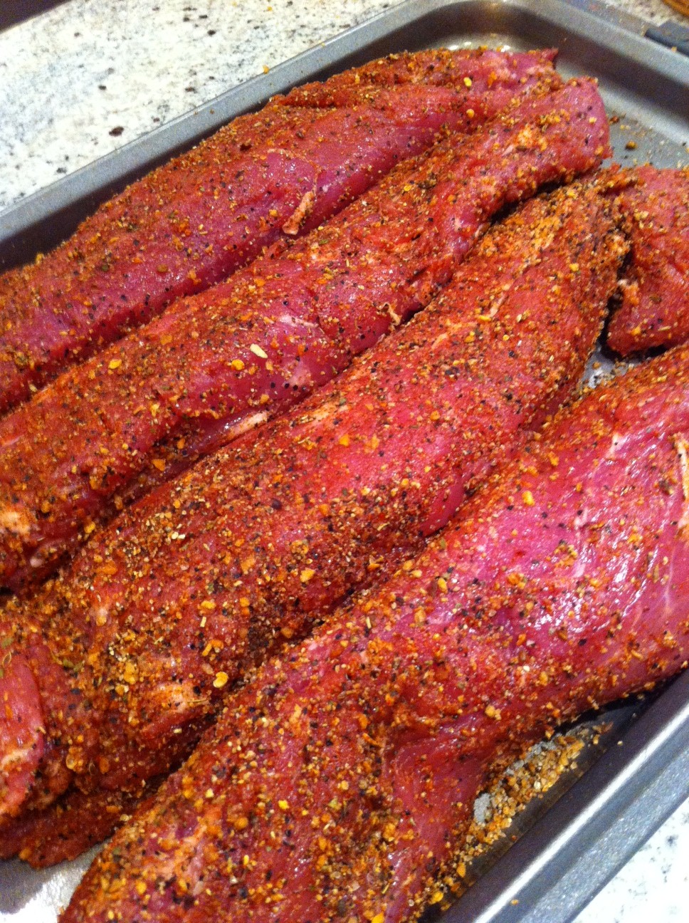 First thing first…get a pork tenderloin…if you will remember last weekend we BBQ’d Costco burgers and so this week I decided let’s do pork. The boxing fight was on this weekend so I knew my dad and brother would be occupied watching sports while I grilled in my own element. Pork is actually pretty easy to grill. The thing(s) you have to be most cautious of are 1) the tenderloin drying out and 2) the internal temperature. To prepare the pork tenderloin…cut away the silver skin and blend some of your favorite spices together for a dry rub. Next heat the BBQ (if its gas) to a high heat then sear/ grill each side of the tenderloin for approximately 5 minutes. If you think it has been too long…you might be right so check the internal temperature. When the tenderloin reaches 140 degrees pull off the grill and let the pork sit covered with tinfoil for about 10 minutes. Cut horizontally….done!