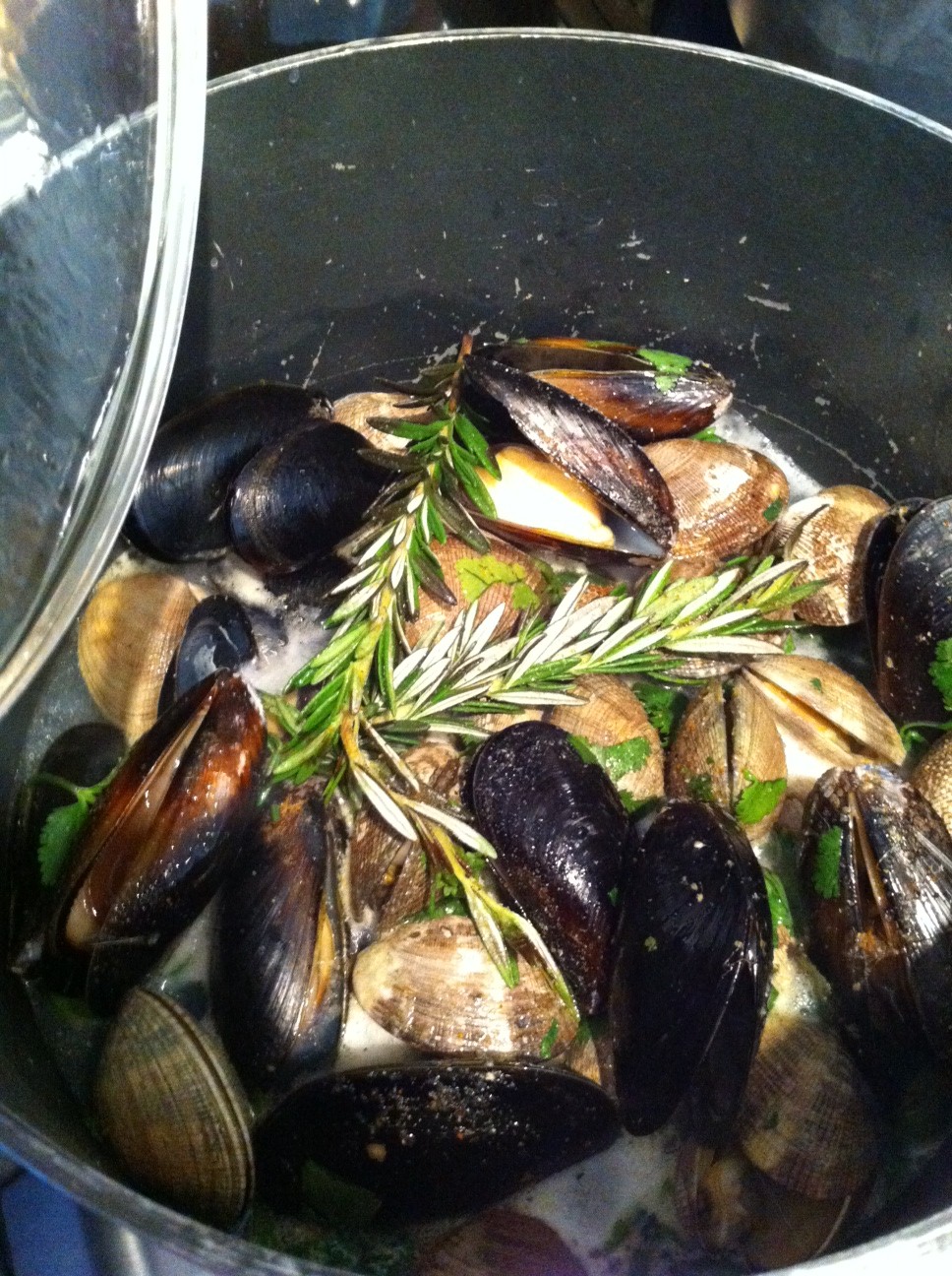 Filled a pot of about 1/4 inch of water…heated the pot up…poured in the mussels and clams and everything else. Let simmer for 5 minutes.
