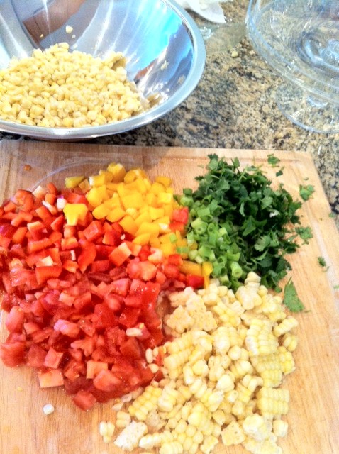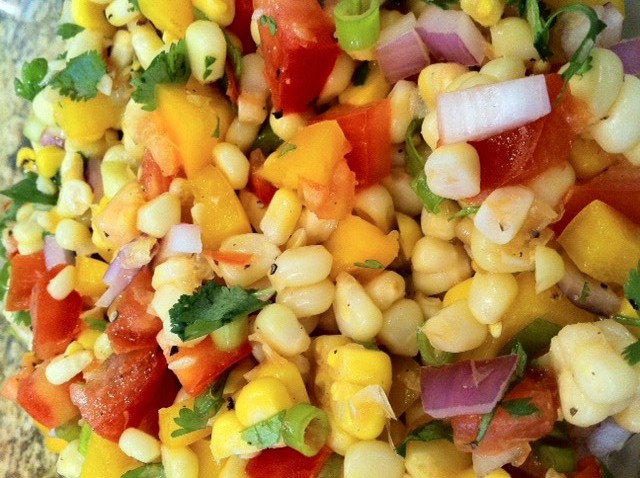 Mix the corn kernels, peppers, tomatoes, onions, and cilantro in a large mixing bowl. Then add the EVOO (not too much), black pepper & salt to taste…done and devoured in less than 24 hours!