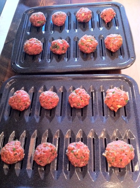 When the ingredients are all mixed, form 2″ round balls and place on a broiling pan.