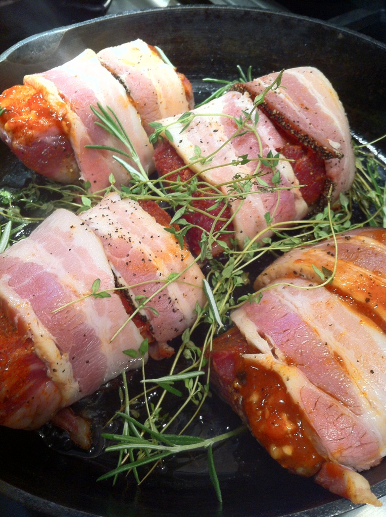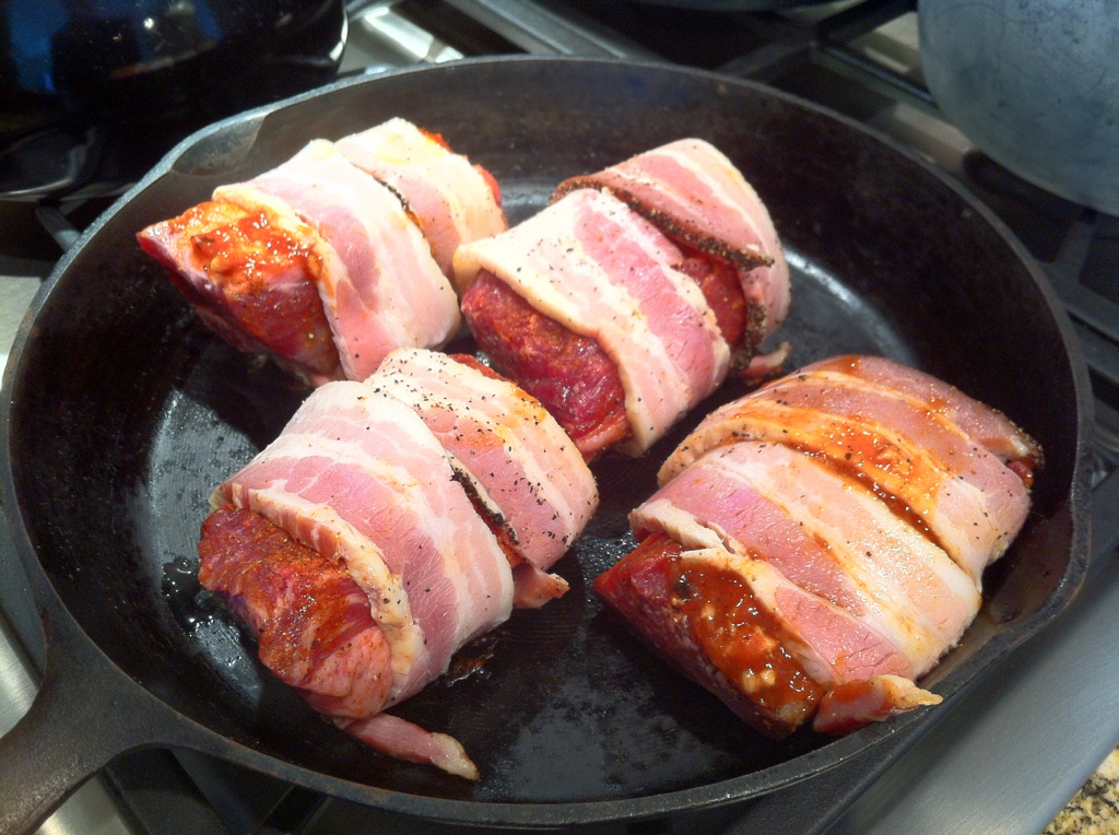 When I got back to our condo, I grabbed the cast iron skillet, made a quick rub of cayenne, paprika, the smallest pinch ever of (truffle salt, curry powder), rosemary, thyme and ground pepper…then wrapped each beef short rib with 1 peppered bacon and 1 smoked bacon and placed on the medium low heated skillet. I cooked for about 1 hr and 10 minutes flipping to cook on each side every 17 ish minutes.