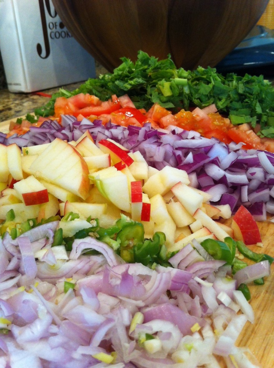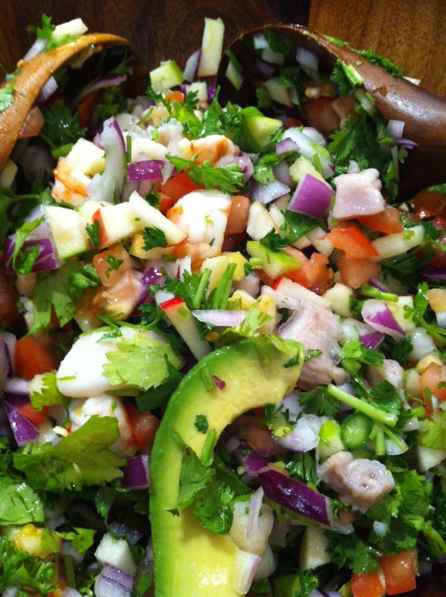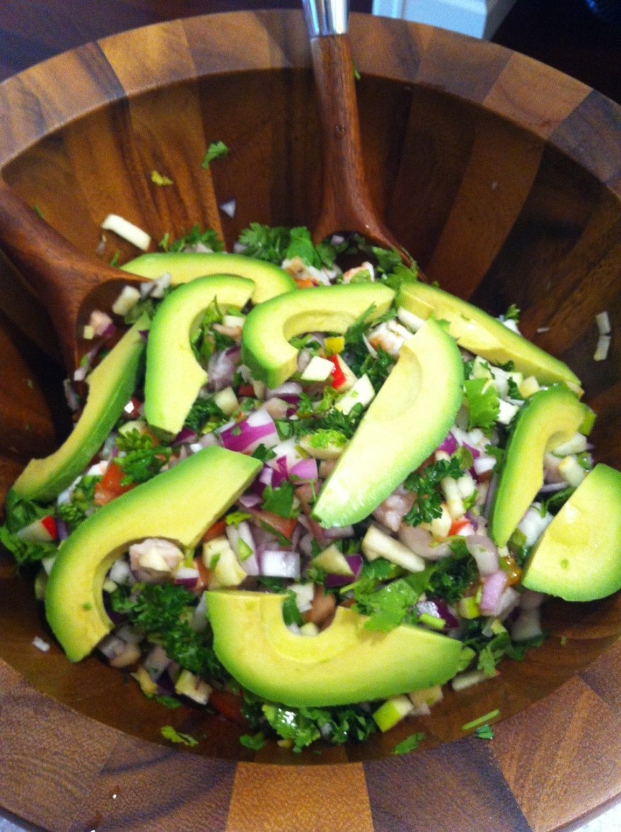 Place into salad bowl and mix. Now add the ceviche from fridge. Here is where it is up to you…I typically dump the juice out and only put the seafood in the salad bowl…however this time I left a little more the juice and added lemon juice to the bowl. I liked this best.