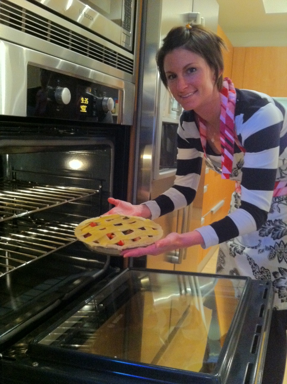 Being that it is that time of year, I thought I would make a pie for Mark. His business partner, Daniel, and Daniel’s girlfriend, Jenny, have an impressive patio herb garden so they gave us all sorts of goodies. I thought I would try the Smitten Strawberry Rhubarb recipe but add my own twist using fresh Lemon Thyme. While I was researching all recipes seem to vary, calling for flour, cornstarch or tapioca – I went the cornstarch route AND I took the crust shortcut :0)