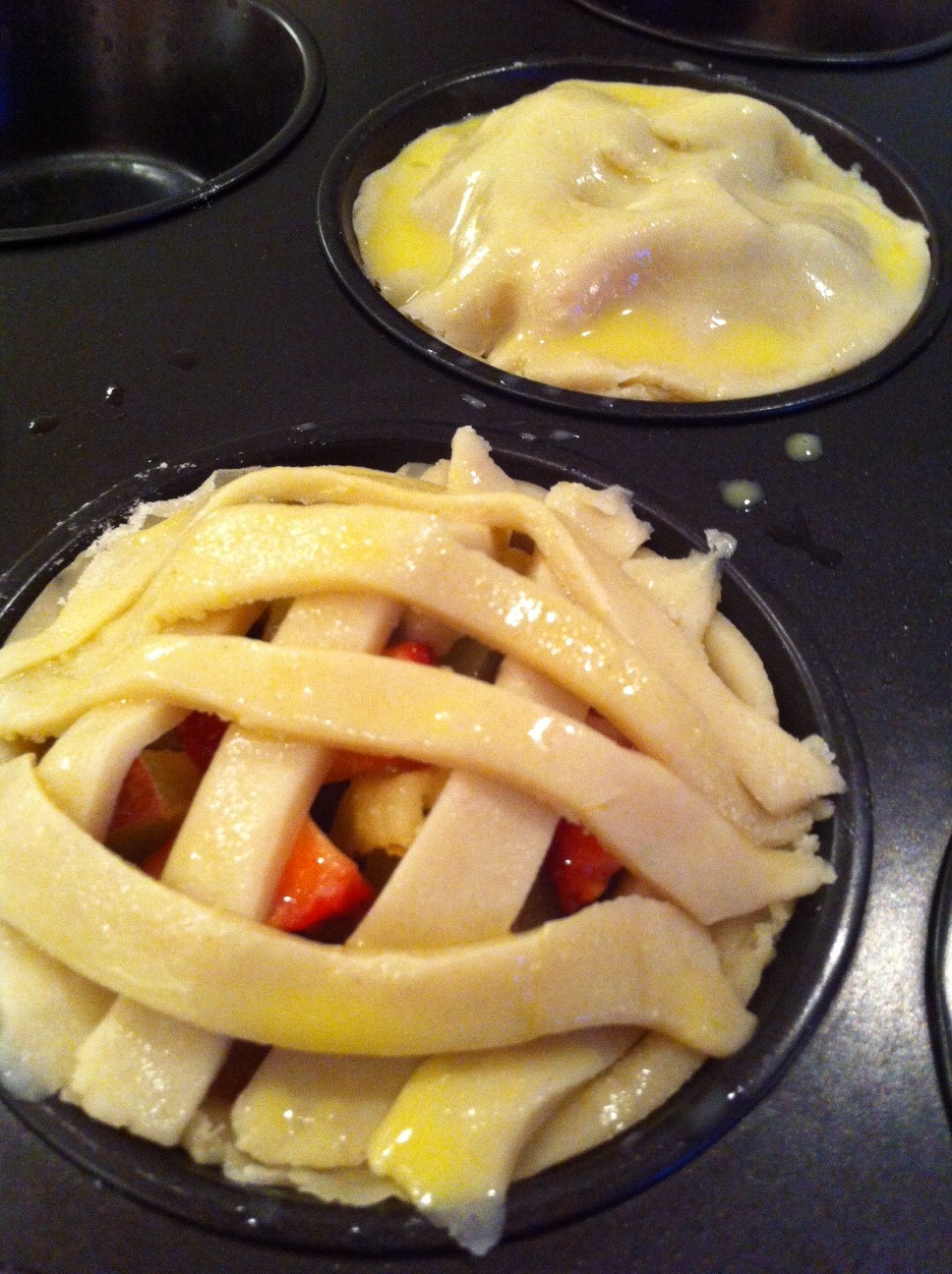 Form the lattice crust by laying 5-7 strips on top of the filling parallel with each other. Then rotate by a quarter turn and lay the remaining strips down parallel with each other.
