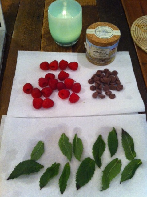 So needless to say, we didn’t have much time for dinner tonight but I (Pinterest inspired) did come up with an easy late-night snack using the leftover raspberries from Sunday’s Costco trip, mint from my parent’s herb garden, milk chocolate Ghirardelli chips and a dash of salt.