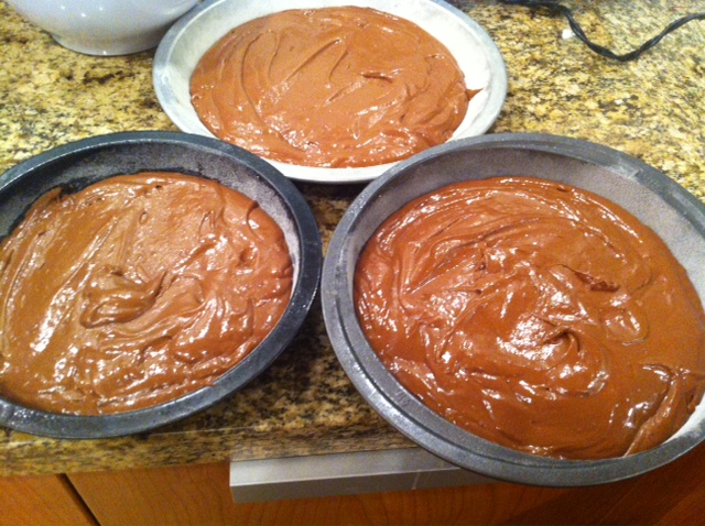 Preheat oven to 350 degrees and lightly butter and flour three 9″ baking rounds (don’t forget the flour- this will help you in the end!)