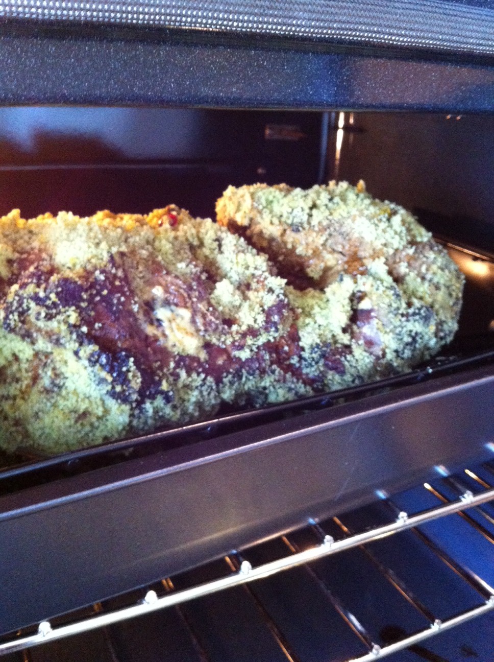 Next we roasted the lamb on 225 for about 1.5 hours. Slow cooking it so we could work out 🙂 Meanwhile we prepared a panko herb crust with a honey dijon spread. For the panko simply add rosemary, thyme and panko bread crumbs with a dash of olive oil to a food processor. The dijon spread was about 3/4 cup dijon mustard and 1/2 cup honey. After my workout (about an hour) we quickly removed the lamb…painted the dijon mustard/ honey spread and coated the lamb with the panko herb crust. MMMMMMMMM…popped it back in the oven and then pulled the lamb at 140 internal temp.