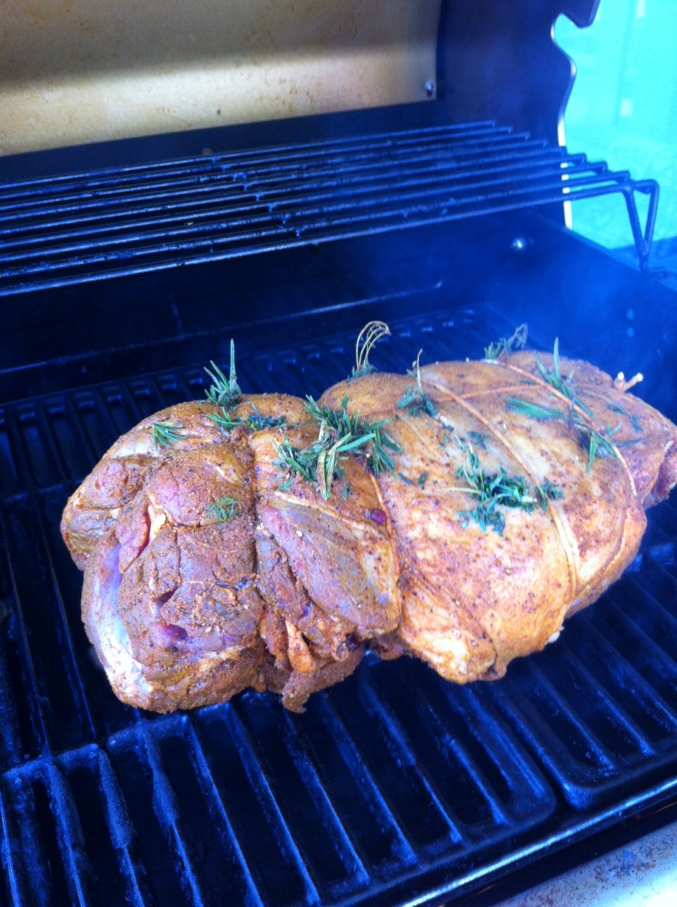On Wednesday, Ash and I went to work…then left at around 4pm to start cooking. We decided to grill/ sear/ char the outside of the lamb. I headed upstairs to my parents place and my dad had soaked hickory wood chips earlier in the day for me. So we fired up the grill laid the wood chips down and heated the grill up to about 450 degrees. Once the grill reached 450 we placed the leg of lamb on the grill for about 12 minutes. MMMMMMM. Then 12 minutes later flipped it (fat side down) to sear off another 12 minutes.