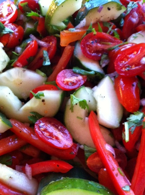 Tagged: 3 medium to large cucumbers, awesome salad ideas, bbq shrimp, bend oregon, chopped 1/2 lemon, finely chopped 1/2 cup fresh cilantro, halved 1 shallot, juiced and added to taste salt & pepper, julienne cut, julienne cut & halved 1 pint cherry tomatoes, seattle food blog, seattle salad, seattle salad ideas, sliced 1 red bell pepper, to taste 1 tbsp white sugar, to taste rice wine vinegar, vegetarian, zydeco, zydeco bend