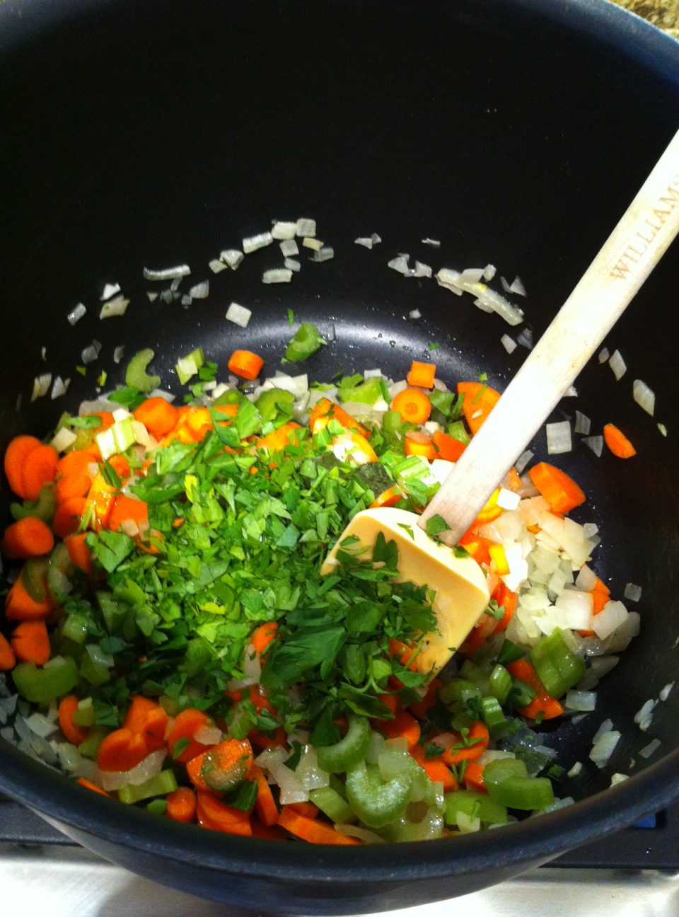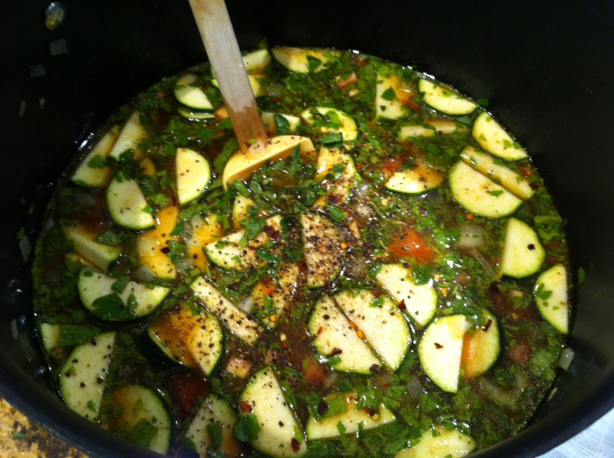 Add the stock, tomato paste, carrots, celery, zucchini, diced tomatoes, basil, oregano, parsley, chili flakes, salt and pepper to the garlic and onions, and cook for 30-45 minutes, until the vegetables are tender.