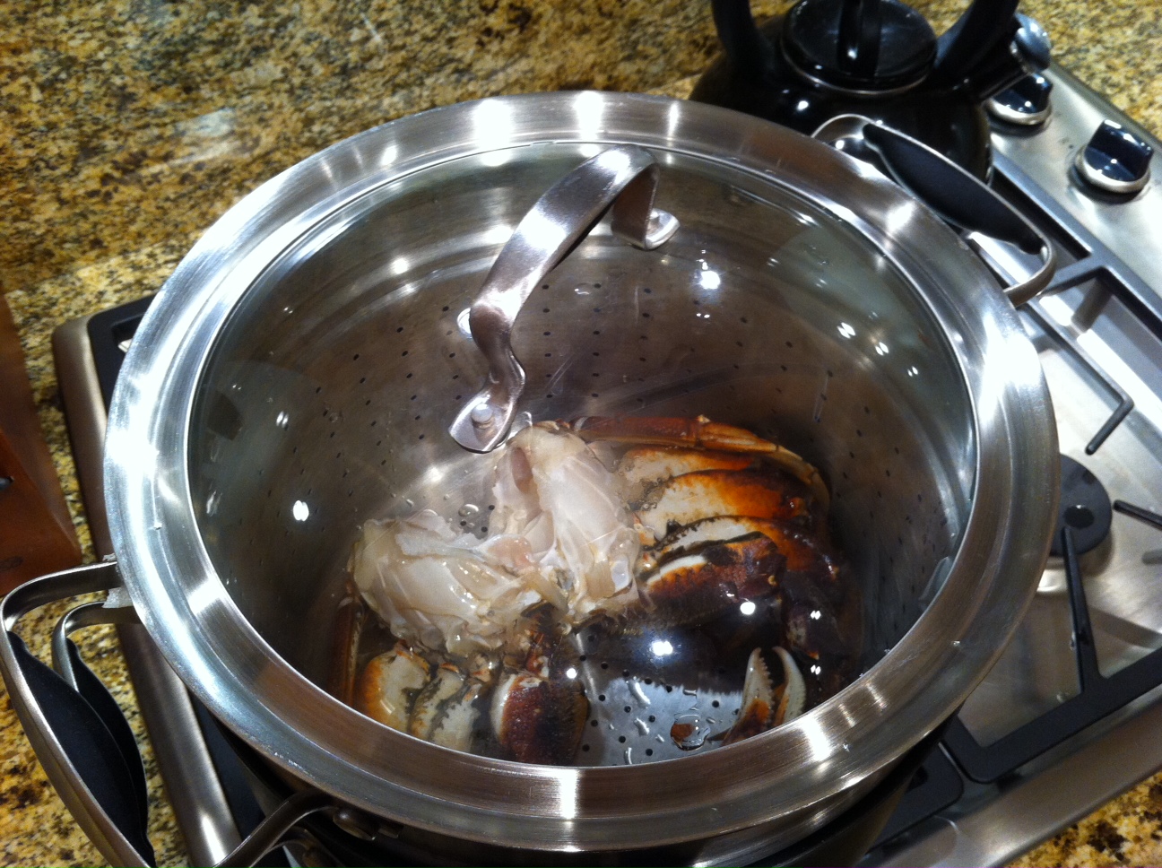 When I got home, I steamed the crab using a steaming insert and it was PERFECT. Basically you just fill the bottom of the larger pot with water (about 2 inches), put the insert inside, place the crab in the insert, cover and steam on high heat for about 7-8 minutes per pound. When the time is up, you can run a little cold water on top of the crab and serve with garlic butter. YUM!!!