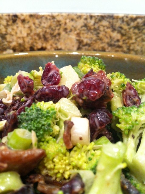 In a large bowl add the broccoli, onions, bacon and cranberries.