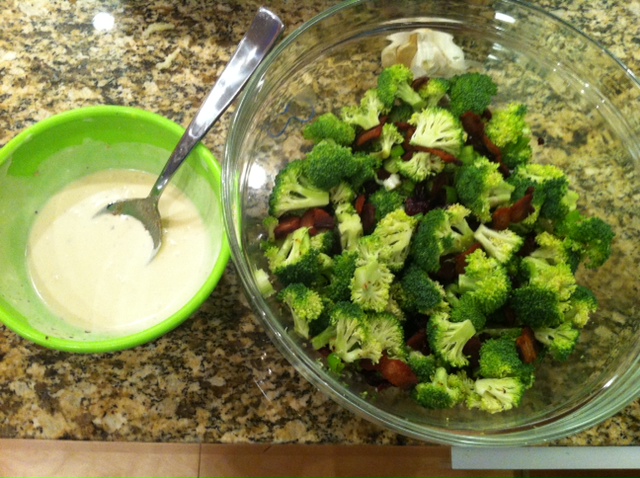 I bought broccoli a couple days ago with the intentions of making a Broccoli Bacon Salad for an election party but my Tuesday got away from me and I couldn’t make it :0( SO, when I got home tonight (3 minutes before the very hungry Mark) broccoli was on the brain. Of course, I still wanted to make my salad but Mark was looking for something a bit more “filing” … I continued while he stood over my shoulder and the very second he found out that I was making a salad he headed towards the pantry and pulled out the pasta- classic Mark :0) He then stole a heap of broccoli and the battle began.