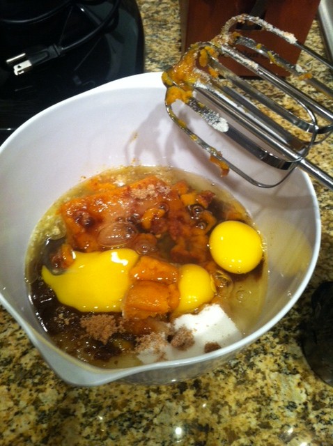 Combine eggs, sugars, pumpkin, butter, spices and vanilla and blend well