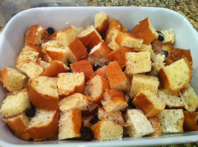 Cut the brioche and place in a lightly buttered 11 x 7 baking dish, coat with the milk/cream and sprinkle with the raisins.