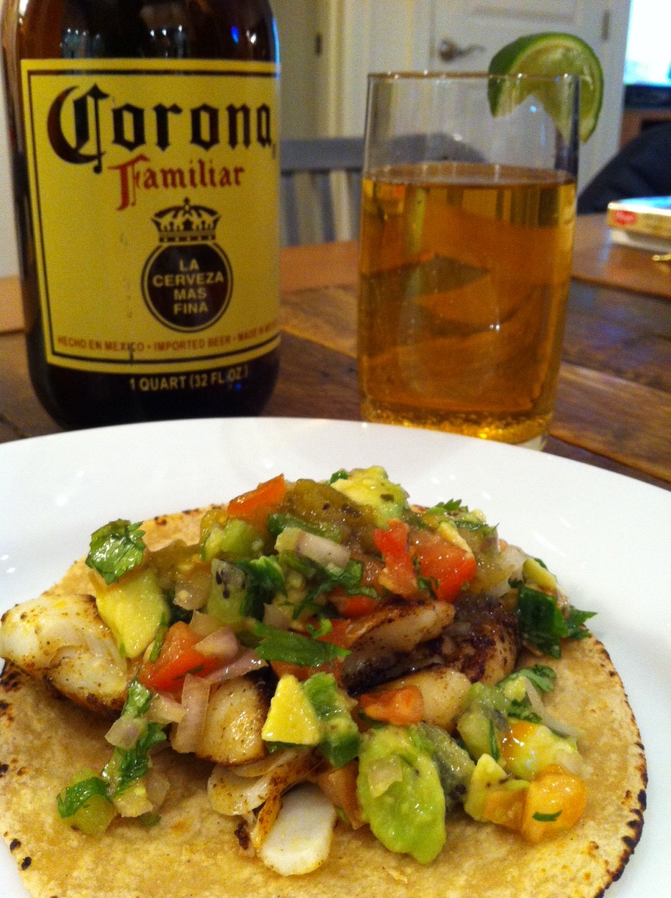 I cut the fish and plated on a small corn tortilla (heated on gas range) paired with a fat corona.