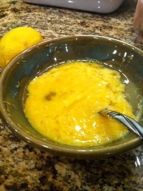 In another bowl, whisk the eggs, lemon zest (2 tbsp) and juice (2 tbsp) and then pour into the flour mixture. Beat until smooth and creamy!