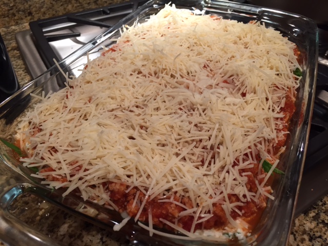 In a baking dish, spread approximately 3/4 cup of the sauce on the bottom and arrange a layer of pasta, lasagna noodles, ricotta mixture, sprinkle of mozzarella, sprinkle of basil, and then sauce. REPEAT. On top of the last sauce layer, sprinkle the remaining mozzarella and parmesan on top to completely cover your lasagna.