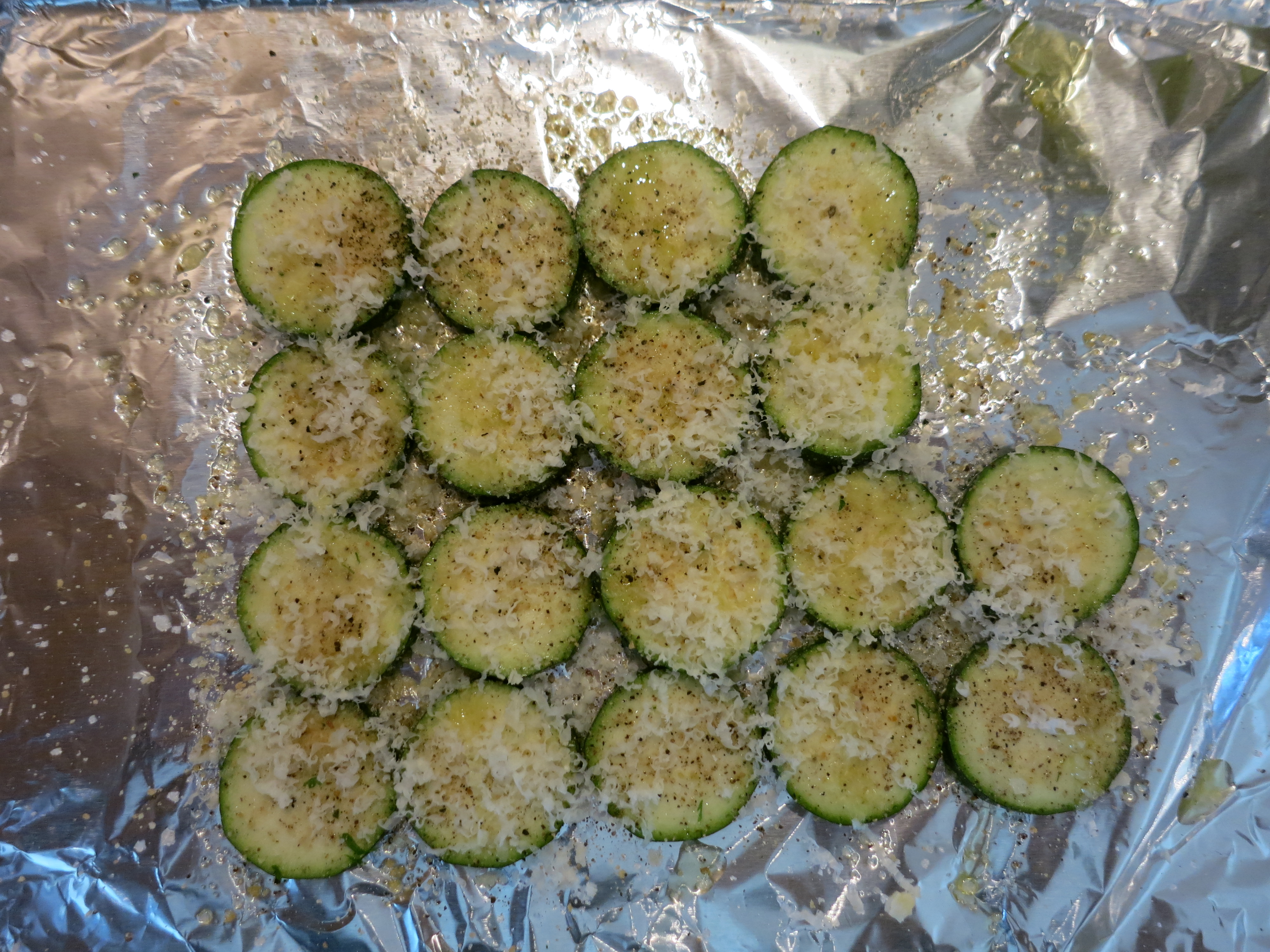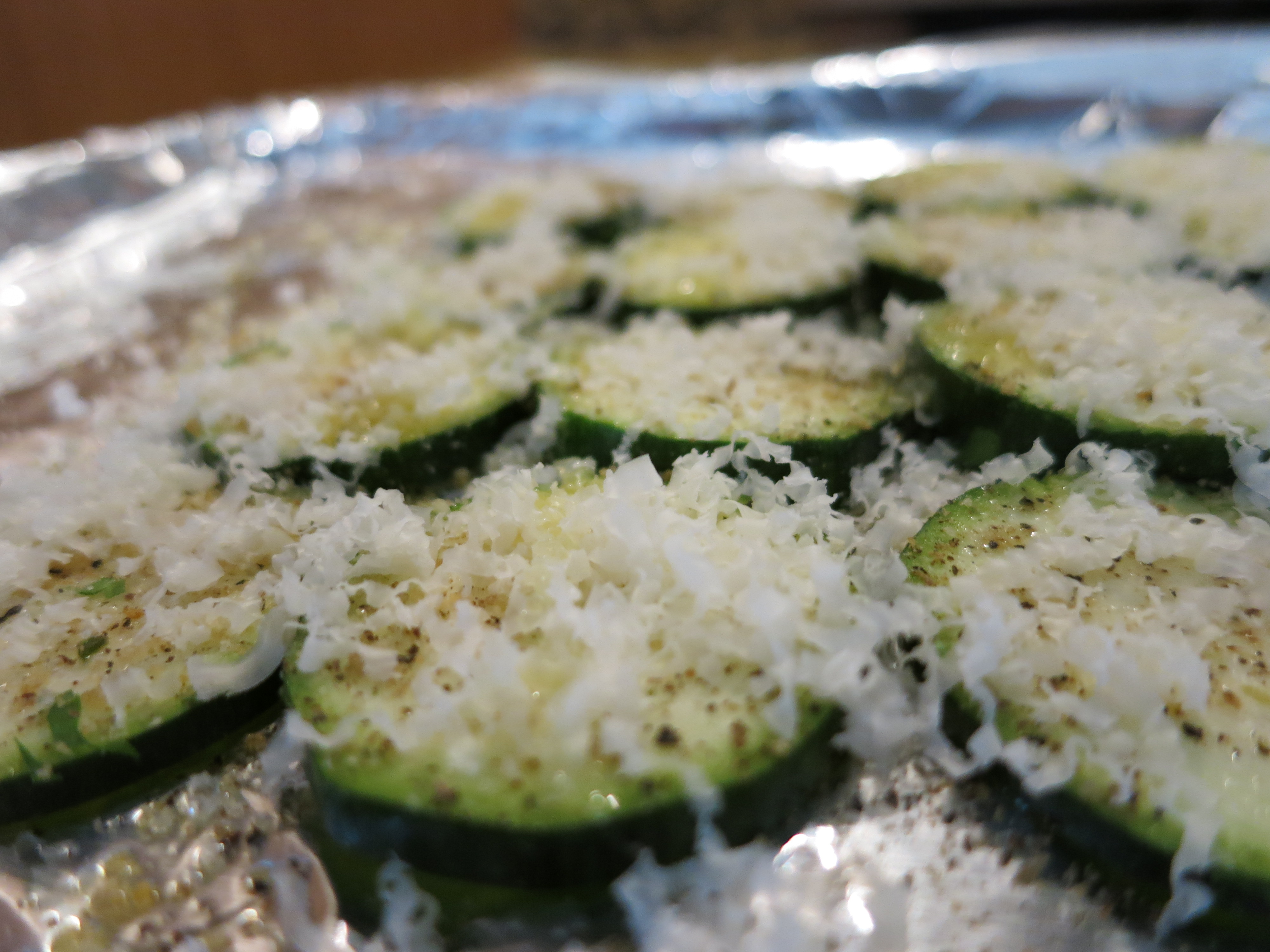 All you do…is slice a Zucchini 1/4 inch…salt, pepper, your favorite finely grated cheese…I used Beechers Flagship and fine breadcrumbs, a little olive oil and done.