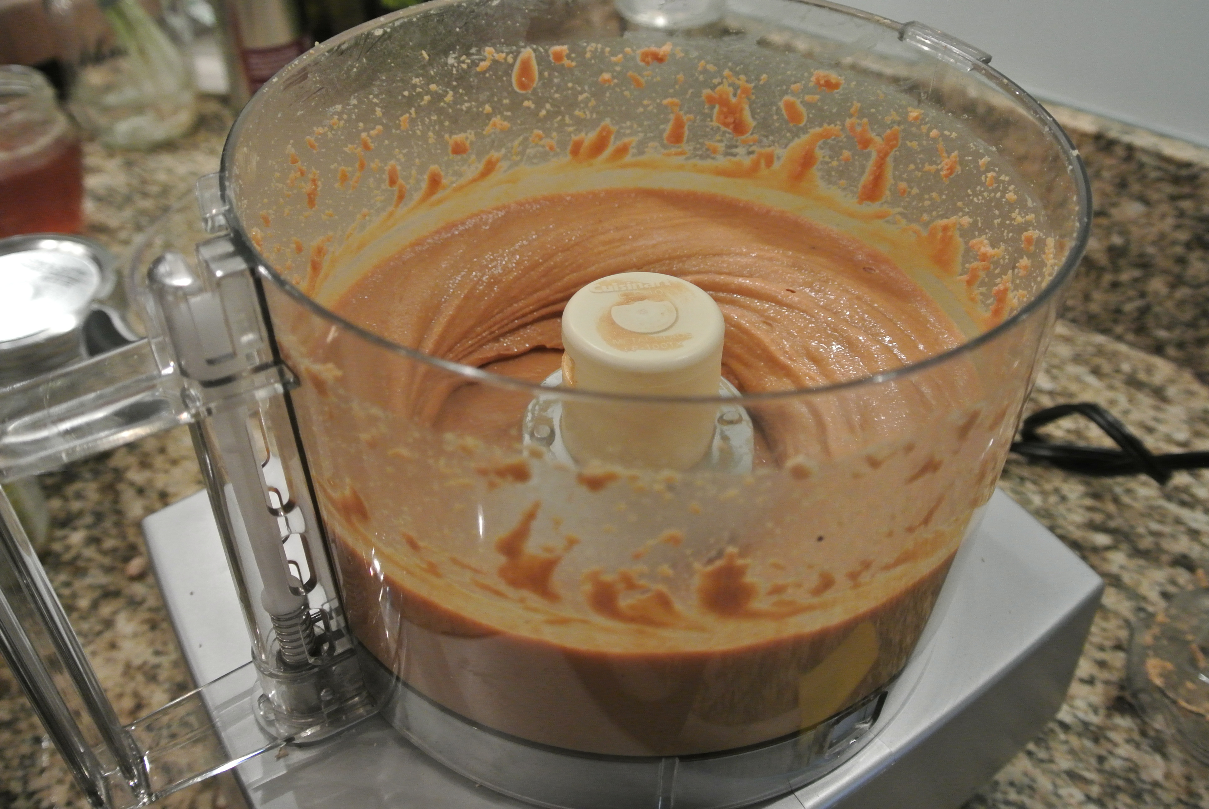 Put peanuts in your food processor and turn it on high. Let it run for about 5-6 minutes…you will see a couple different stages. 1st- the peanuts will look finally chopped. 2nd- they will clump in a solid ball and you will worry if you are ruining your food processor…keep going. 3rd- you can scrape the sides of the processor a bit but eventually the peanuts will start to cream.