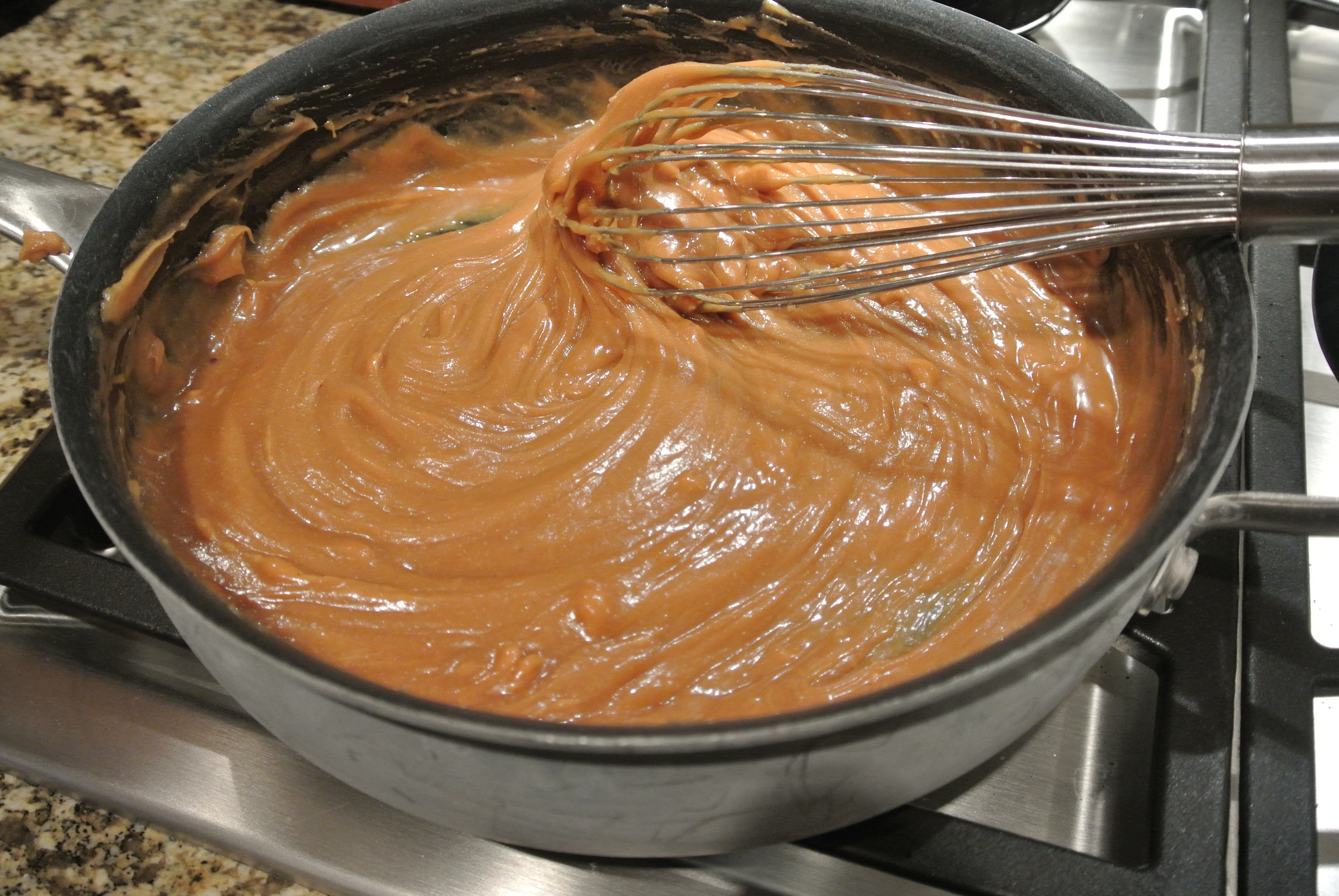 In a large saucepan, combine the peanut butter and agave while whisking on medium heat.