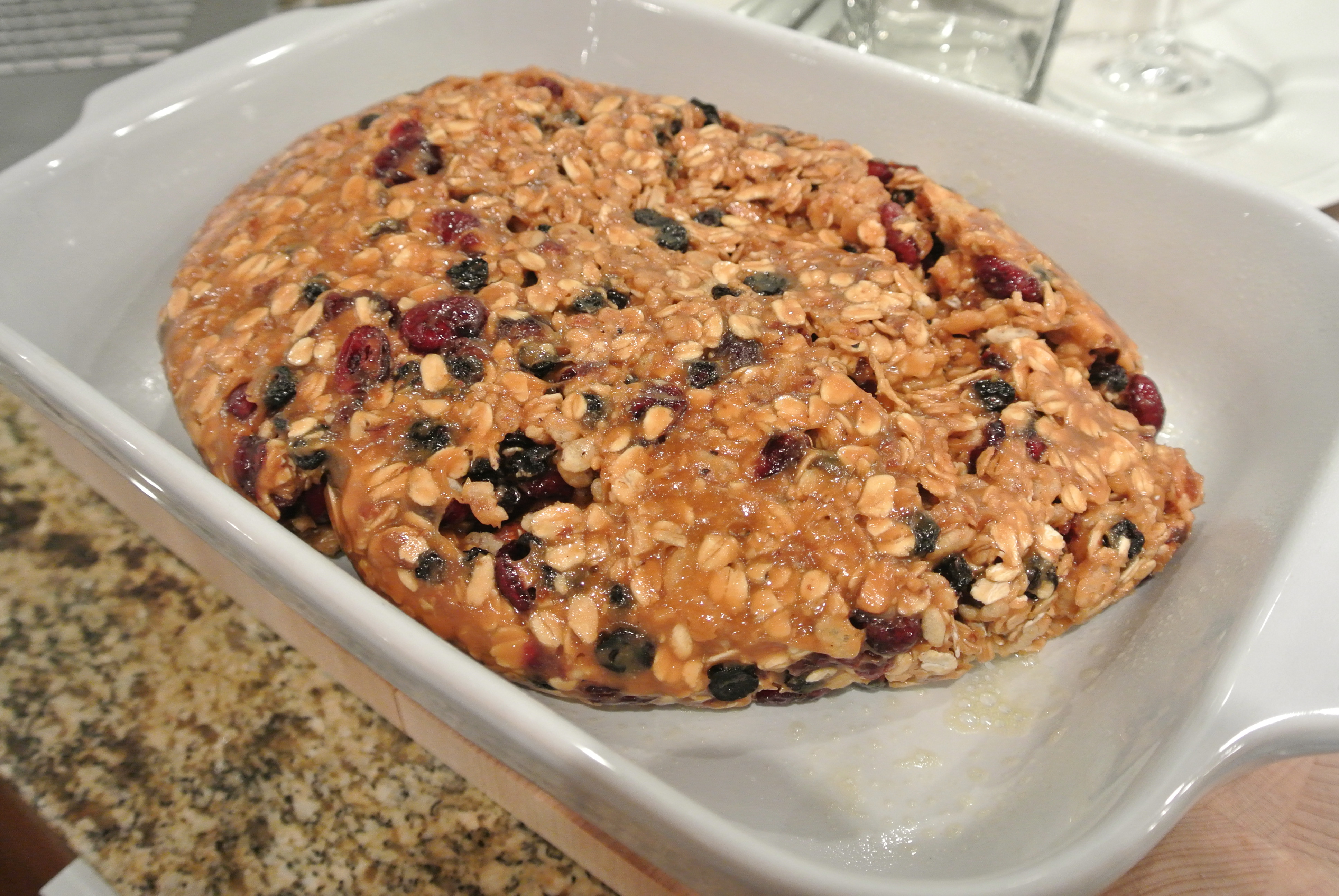 Stir in the oats, cereal, almonds, cranberries and blueberries.